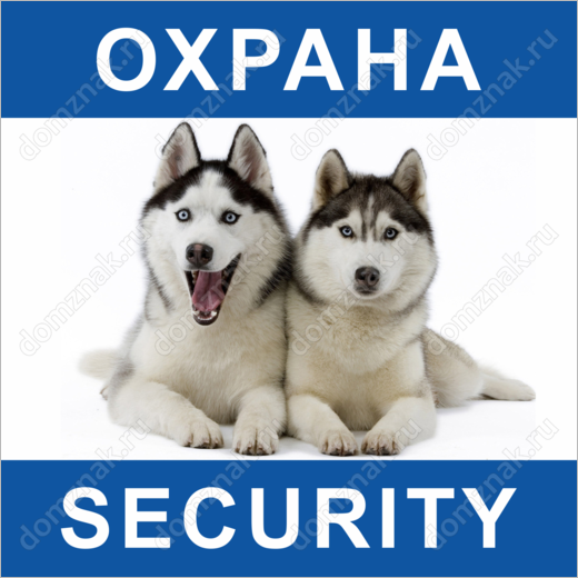 Качественная информационная табличка «Охрана хаски» донесет до окружающих информацию, что ваш участок, дом или предприятие охраняют собаки породы хаски. Она содержит надпись-предупреждение на русском и английском языках. Для усиления послания на табличку нанесено изображение псов-охранников.
