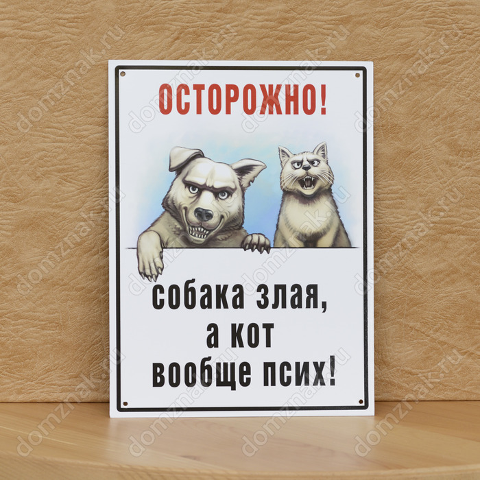 Табличка «Злая собака, а кот вообще псих» станет отличным средством защиты объекта от злоумышленников и расскажет о хорошем чувстве юмора его владельца. Этот предупреждающий знак вызовет улыбки у всех, кто проходит мимо. Донесите до окружающих информацию о том, что с животными, проживающими на вашей территории, лучше дела не иметь.