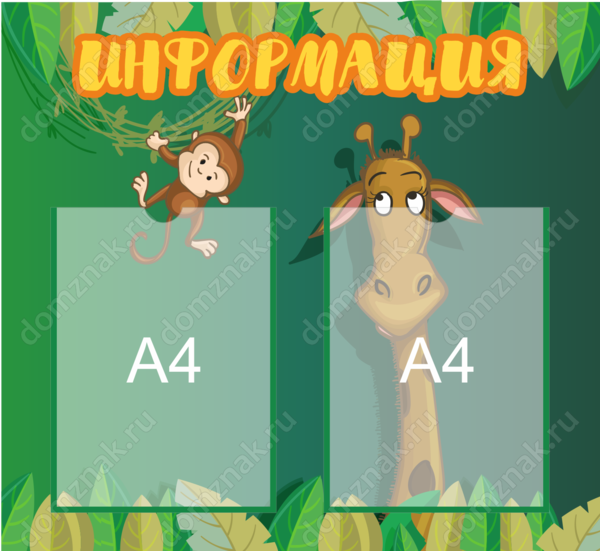 Небольшой «Информация» для детского сада позволит рассказать мамам и папам важные новости, не занимая много места. Обратите внимание на дизайн стенда: когда вы вставите в карманы листы, картинка будет выглядеть так, будто жираф и обезьянка выглядывают изнутри. Впрочем, стенд хорошо смотрится и «сам по себе», так что, если важных событий не намечается, оставьте его незаполненным.