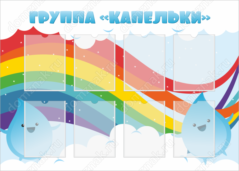 Стенд «Группа капельки», который обычно размещается в садике. Это отличное оформление группы. Цвета дополняют собой детскую, веселую атмосферу и заполняют собой комнату. Яркая радуга так и разливается по детским лицам. И это очень хорошо, так как стенды являются визитной карточкой садка!