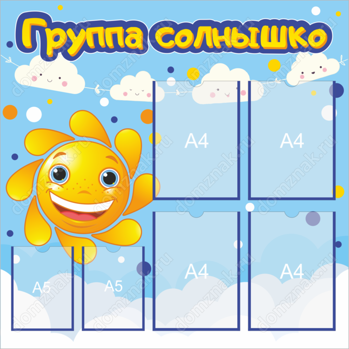 Каждая группа в детском саду должна иметь свой уголок, в котором будет размещена вся важная и полезная информация для родителей, воспитателей и маленьких детей. Веселым и жизнерадостным воспитанникам дошкольного учреждения непременно понравится оригинальный стенд «Группа солнышко». Он яркий и привлекающий внимание, выполнен в приятных цветах, а также украшен улыбчивым нарисованным солнцем и держащимися за руки тучками. Стенд оснащен 6 карманами для размещения информационных материалов формата A4 и A5.
