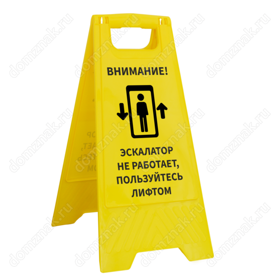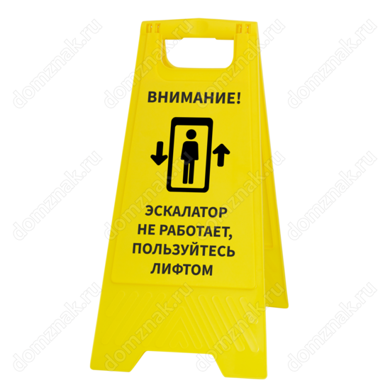 Если в вашем заведении перестал работать эскалатор, тогда вам понадобится табличка на пол «Эскалатор не работает, пользуйтесь лифтом». Она устанавливается рядом с не функционирующим эскалатором, в зоне видимости для посетителей. Табличка имеет яркую контрастную надпись, выполненную черным цветом. Ее усиливает изображение, которое улучшит визуальное восприятие нанесенного послания. Желтая поверхность таблички отлично сочетается с надписью и привлекает всеобщее внимание.
