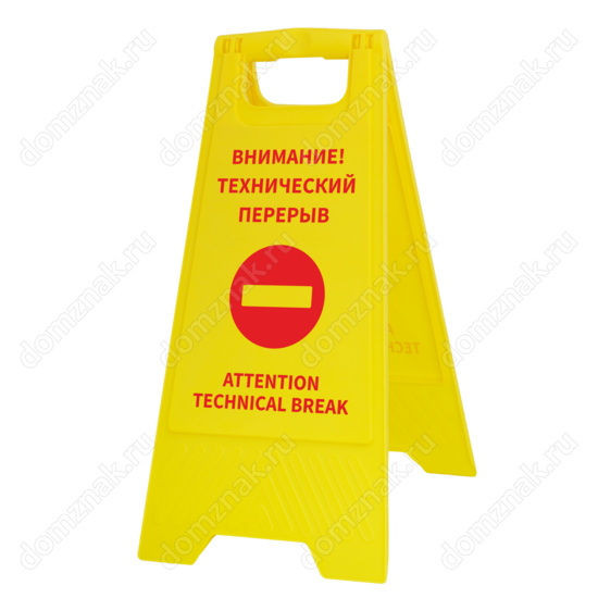 Установите табличку на пол «Внимание, технический перерыв», чтобы предупредить посетителей. Используйте ее в общественных заведениях и местах, где оказываются услуги. На поверхность таблички нанесены яркие надписи на английском и русском языках. Чтобы усилить послание, оно дополняется насыщенным запрещающим знаком красного цвета. Сама табличка отлично привлекает внимание и не остается незамеченной.