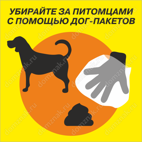 Табличка «Убирайте за питомцами с помощью дог-пакетов» изготавливается на основе из пластика ПВХ или оцинкованного металла.