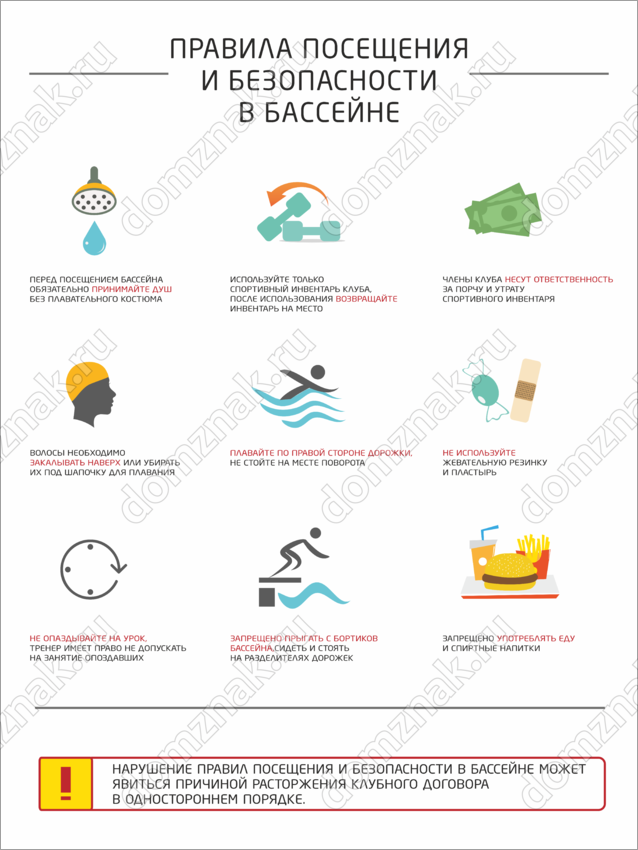 Табличка «Правила посещения и безопасности в бассейне» изготавливается на основе из пластика ПВХ или оцинкованного металла.