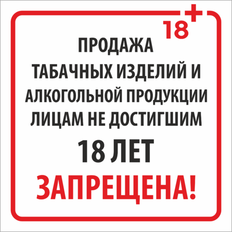 Продажа табачных изделий и алкогольной продукции лицам не достигшим 18 лет запрещена!