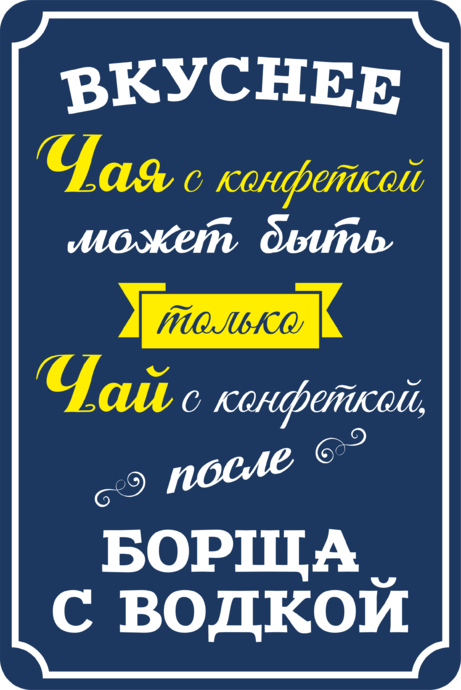 Прикольные таблички – оригинальный дизайнерский акцент в интерьерных решениях кафе или ресторана. Закажите табличку «Вкуснее чая с конфеткой…» - забавный текст и контрастная цветовая гамма привлекут внимание гостей и к табличке, и к меню заведения.