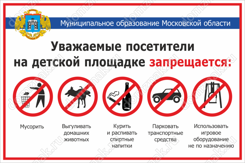 Табличка «На детской площадке запрещается» изготавливается на основе из пластика ПВХ или оцинкованного металла.
