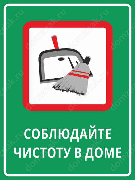 Естественное сочетание темно-зеленых и красных тонов часто встречается в природе, а потому, несмотря на несколько агрессивную окантовку изображения, знак выглядит гармонично и привлекает внимание. В качестве символов чистоты используется веник и совок – табличка «Соблюдайте чистоту в доме» напомнит жильцам о необходимости соблюдать порядок.