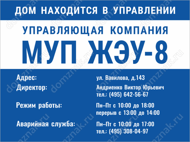 Табличка «Управляющая компания» содержит необходимый минимум информации об УК – название, адрес, ФИО директора, график работы и контактные данные. Крупный шрифт, темно-синий фон, лаконичный дизайн – табличка выдержана в официально-деловом стиле и может быть изготовлена в различных вариантах.